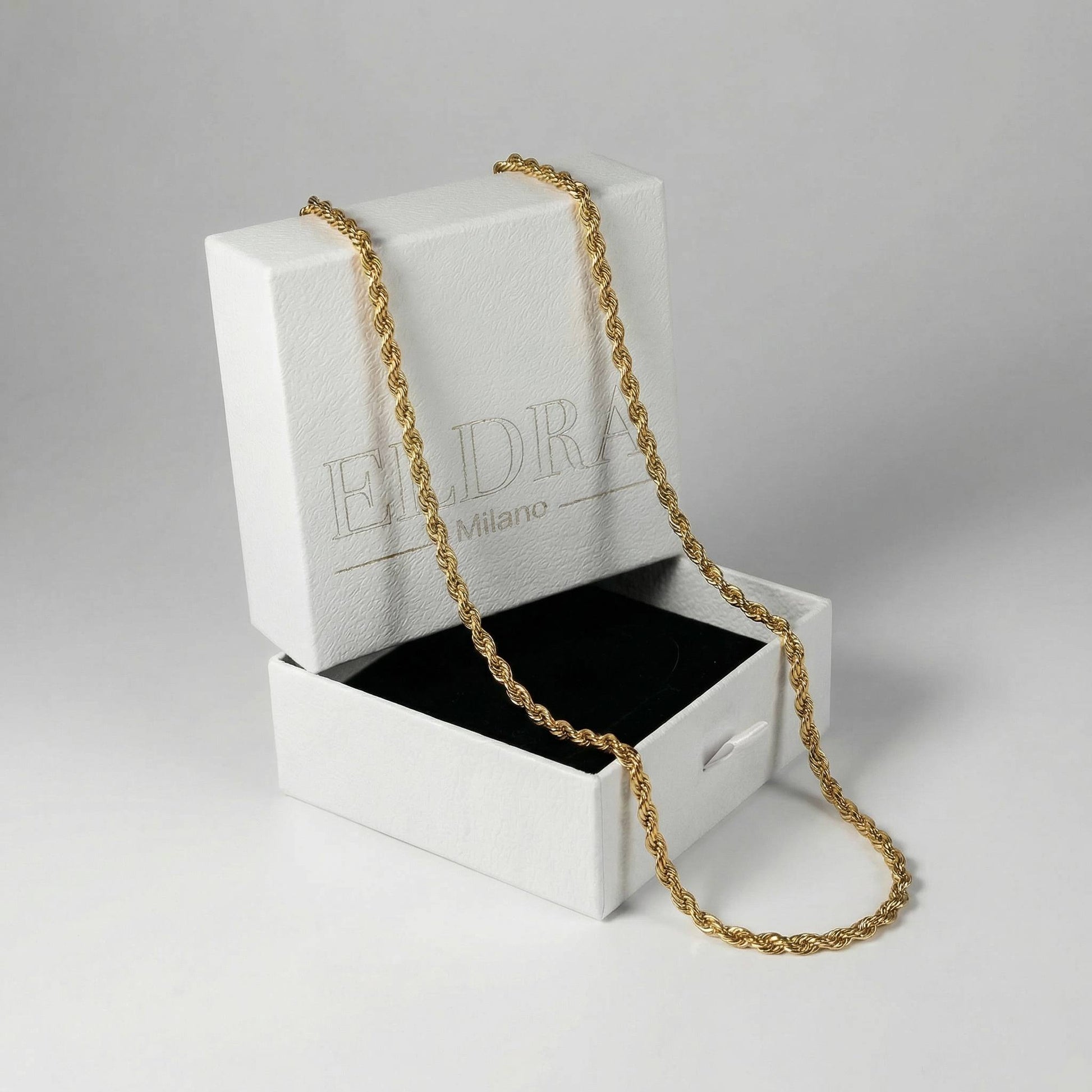 La bellezza dei gioielli Eldra inizia dalla confezione. Ogni pezzo viene custodito nel nostro packaging di lusso: una scatola rigida premium con il nostro logo inciso direttamente nel nostro laboratorio.